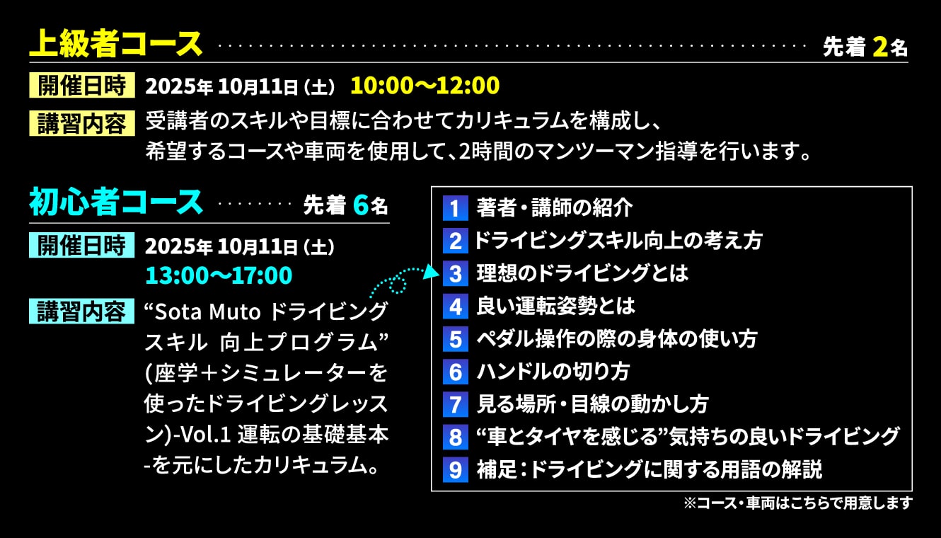 フェラーリジャパンカップ2025年 シリーズチャンピオン、ウィリアムズF-1チーム eスポーツドライバーである武藤壮汰選手が、自身のドライビング理論をまとめた “Sota Muto ドライビングスキル 向上プログラム”Vol.2を開催いたします。