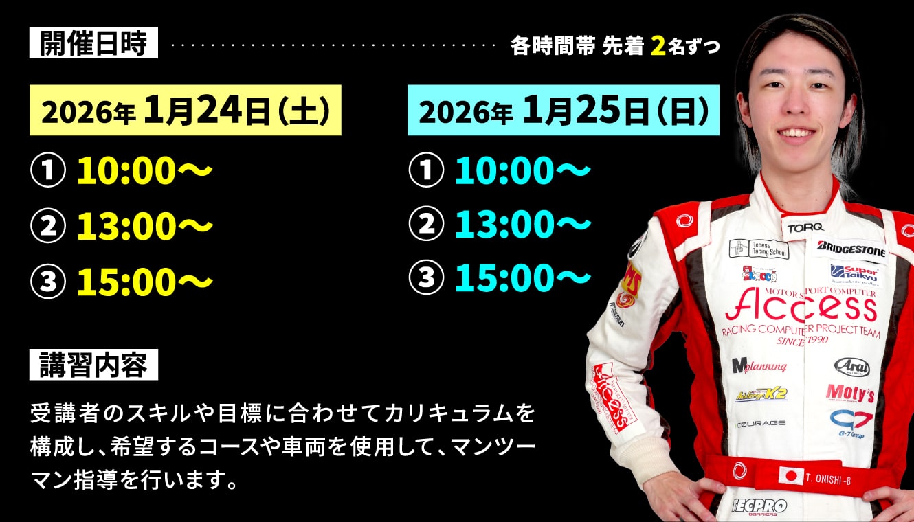 例)「ドライビングスキル向上プログラムに参加したいです。24日の10:00〜希望です」など